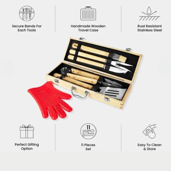 Materials: Stainless steel tools, hardwood case, silicone glove