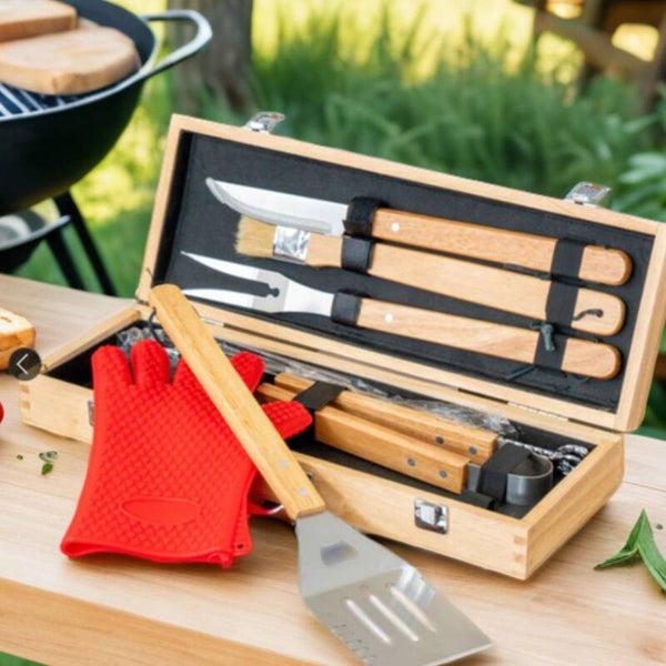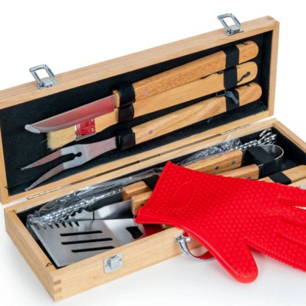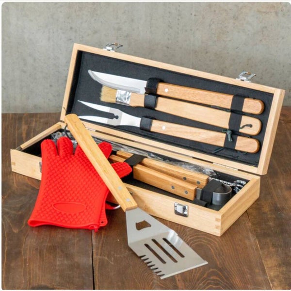 Make move-in night memorable. This custom 11-piece BBQ set arrives in a handsome laser-engraved hardwood case—a useful gift clients will enjoy all year, with your branding on the back of the case.