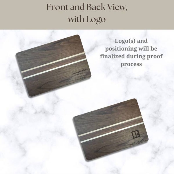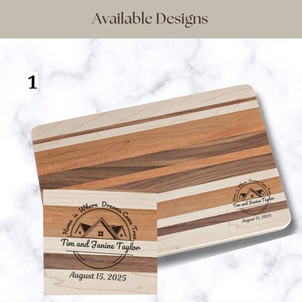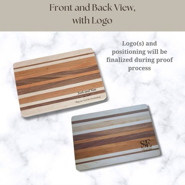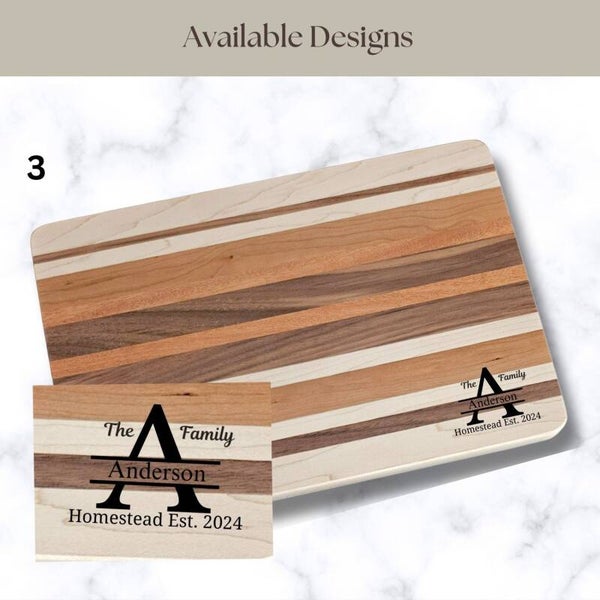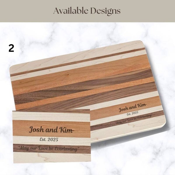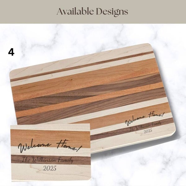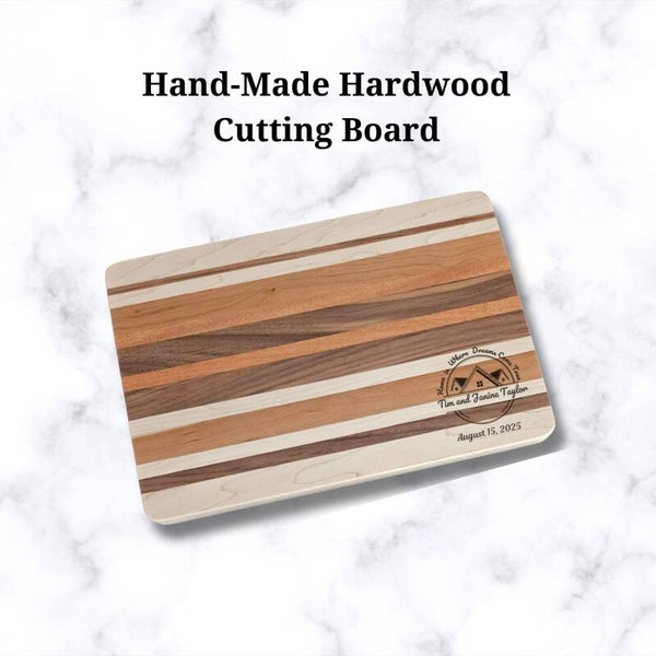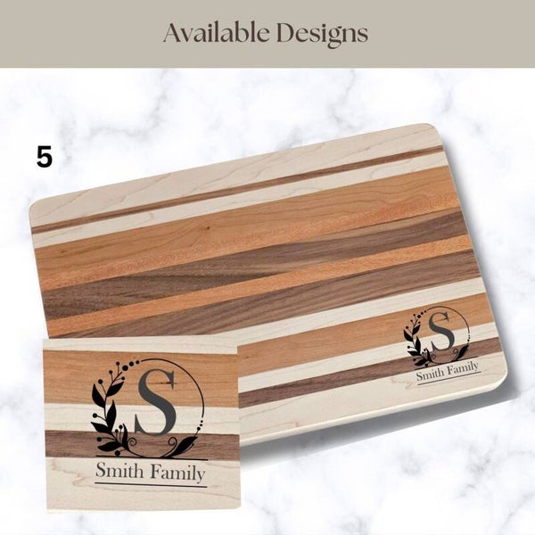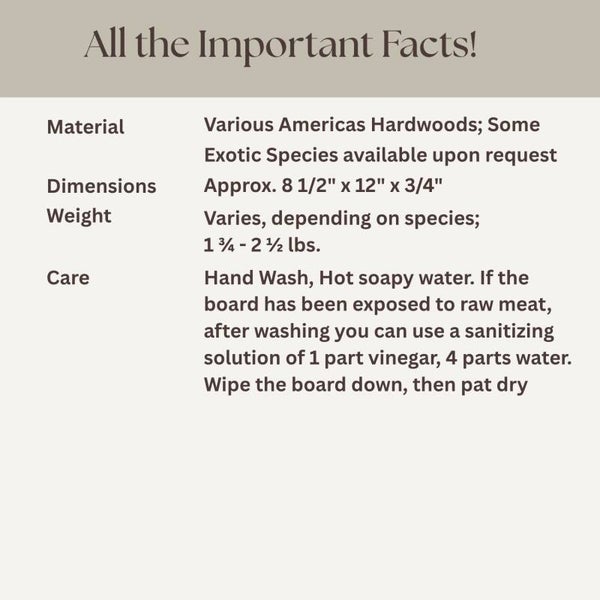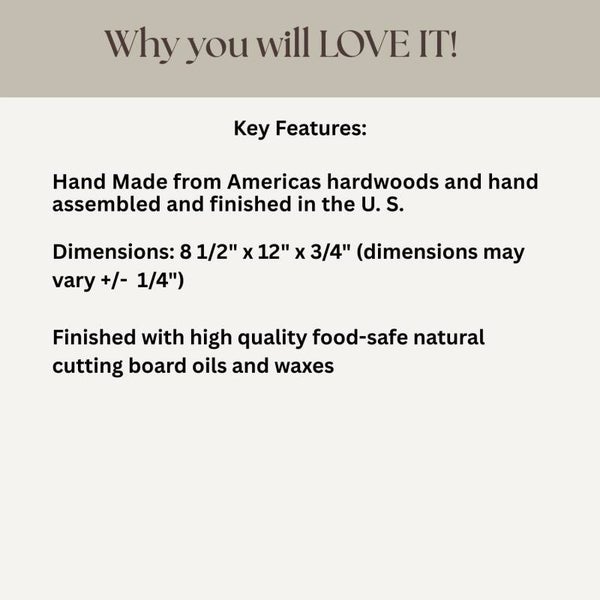 Solid Hardwood cutting board, made from aged and air-dried North and South American hardwoods. High-Quality food-safe finish of mineral oils and beeswax. Hand made and finished in our shop in Oklahoma. Actual dimensions: 8 1/2" x 12" x 3/4"; weight 1 3/4 - 2 1/2 lbs. Can be engraved with any of the designs listed below. Custom designs can be developed, as well. Just ask.