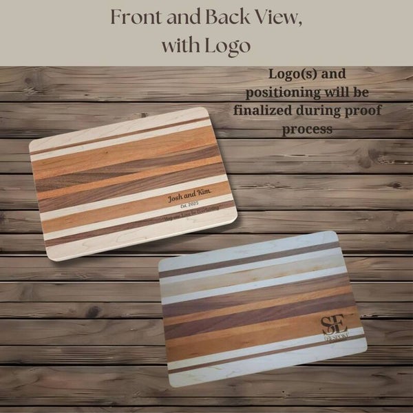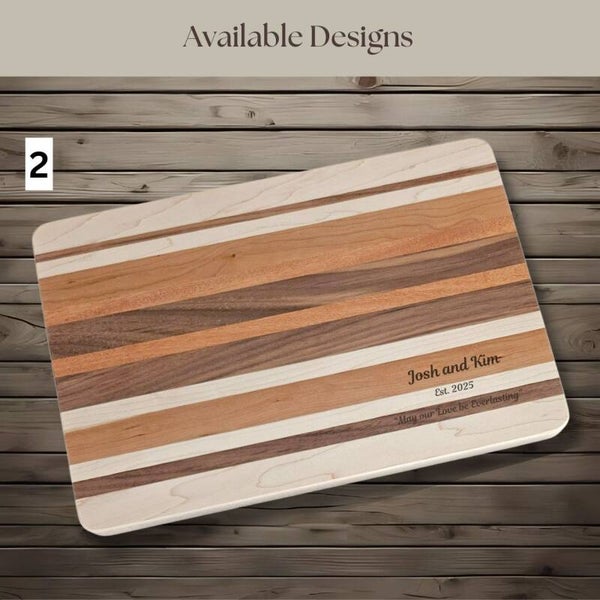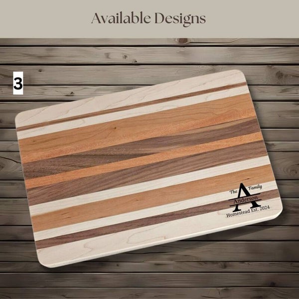 Solid Hardwood cutting board, made from aged and air-dried North and South American hardwoods. High-Quality food-safe finish of mineral oils and beeswax. Hand made and finished in our shop in Oklahoma. Actual dimensions: 9" x 13 1/2" x 3/4"; weight 1 3/4 - 2 1/2 lbs. Can be engraved with any of the designs listed below. Custom designs can be developed, as well. Just ask.